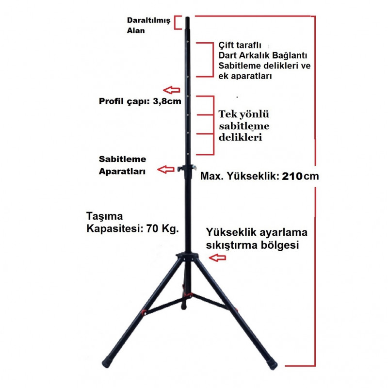Tripod taşıyıcı ayaklık. ; Hoparlör amfi dart vb amaçlara uygun, 70 kg taşıma kapasiteli, 120-220 cm ayarlanabilir yükseklik ayarlı, best marka metal profil üç ayak. ; Kilitli pim ve sabitleme vidaları mevcuttur. ; Ayrıca üst profilde dört adet tek yönlü ve iki adet çift yönlü bağlantı delikleri mevcuttur. ; Iki adet çift yönlü delikler için ayrıca montaj aparatları eklenmiştir. ; Ayrıca dart sporunda kullanım için de montaj düzeneği tasarlanmıştır. ; Günlük kullanıma uygun, bağlantı düzeneği dayanıklı, ayarlanabilir ve taşıyıcı malzemelesi metal profilden üretilmiştir. ; Ürün, ambalajlı olarak dartsan tarafınca ücretsiz kargo ile gönderilir.;